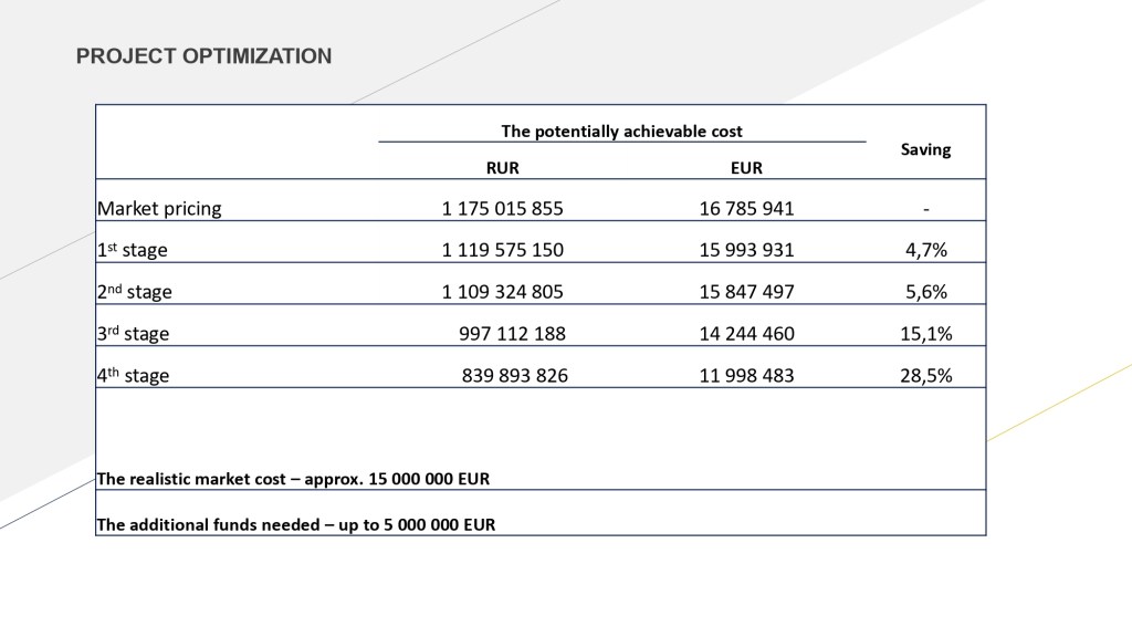 As a result, after implementing Stage 4 optimizations, the project budget is reduced to 12.0 million EUR, representing a 28.5% reduction compared to the original market-based estimate.