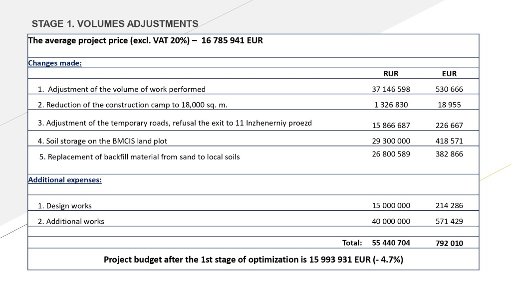 - Optimization of temporary roads, including refusal of the exit to 11 Inzhenerniy Proezd, which reduced unnecessary infrastructure works.