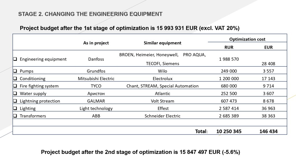 As a result, after implementing Stage 3 measures, the project budget is reduced to 14.24 million EUR, representing a 15.1% reduction compared to the original market-based budget.