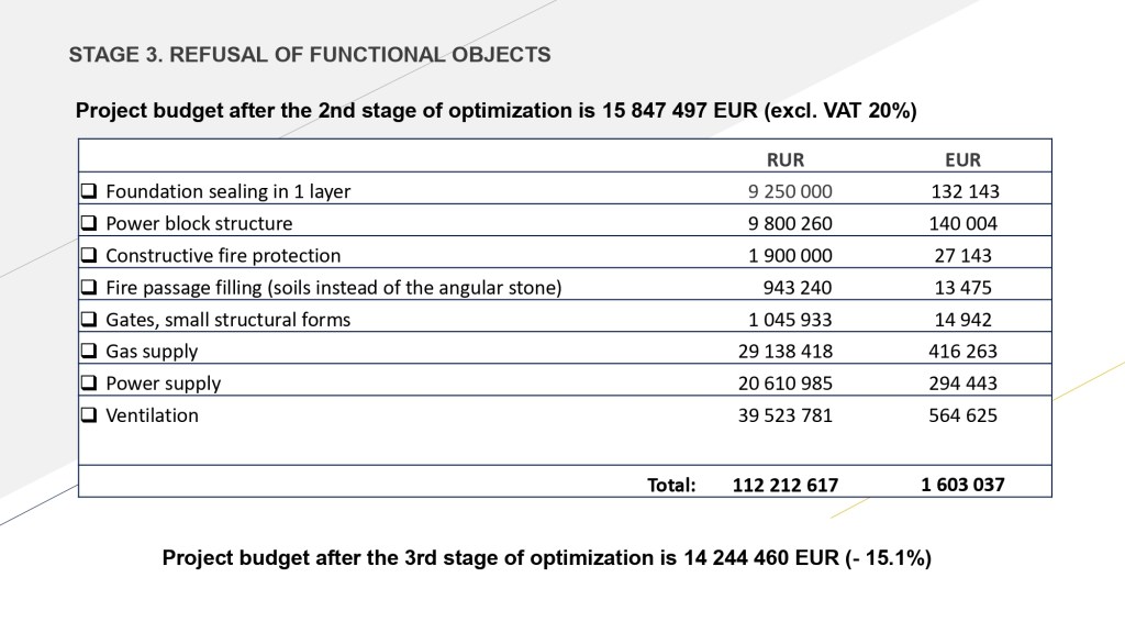 This slide presents the third stage of project optimization, which focuses on removing or simplifying non-critical functional objects and systems that are not essential for the core operation of the facility.