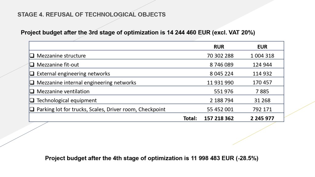This slide presents the fourth and final stage of project optimization, which focuses on excluding technological objects and auxiliary infrastructure that are not required for the base operational scenario of the project.